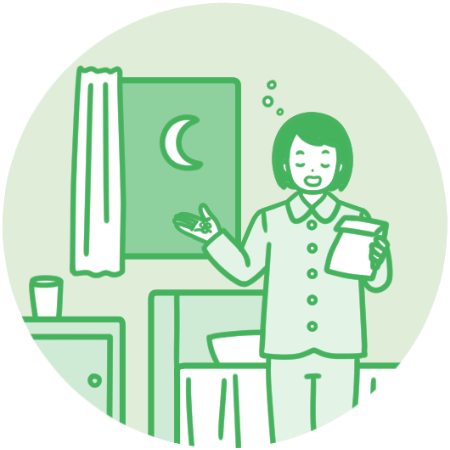 - 寝ころんだまま薬を飲むと、薬がのどに引っ掛かりやすくなるので、必ず体を起こしてから飲むようにしましょう。